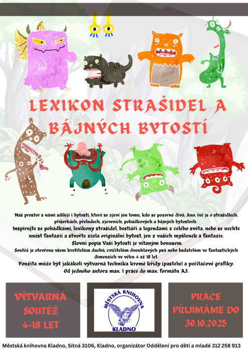 Soutěž je otevřena všem krotitelům duchů, cvičitelům dvouhlavých psů nebo badatelům ve fantastických dimenzích ve věku 4 až 18 let. Svět není jen to, co je vidět pouhým okem. Náš prostor s námi sdílejí i bytosti, které se zjeví jen tomu, kdo se pozorně dívá. Ano, řeč je o strašidlech, příšerkách, přeludech, zjeveních, pohádkových a bájných bytostech. Inspirujte se pohádkami, lexikony strašidel, bestiáři a legendami z celého světa, nebo se nechte unést fantazií a stvořte zcela originální bytost, jen z vašich myšlenek a fantazie. Slovní popis Vaší bytosti je vítaným bonusem.