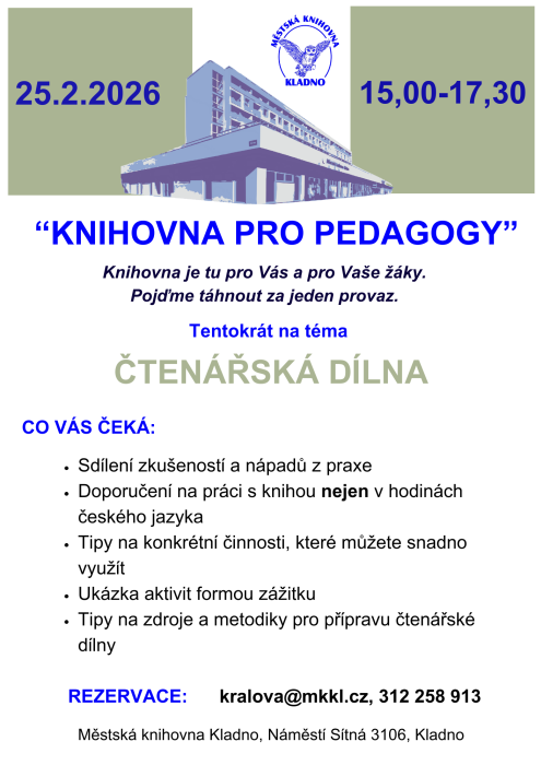 Oblíbená forma setkání pedagogů se službami, které mohou podpořit a doplnit jejich výuku, včetně ukotvení případné další spolupráce. Téma ČTENÁŘSKÁ DÍLNA zastřešuje sdílení zkušeností a nápadů z praxe. Doporučení pro práci s knihou nejen v hodinách českého jazyka. Tipy na konkrétní činnosti, ukázky aktivit a zdroje metodik pro přípravy čtenářských dílen.
