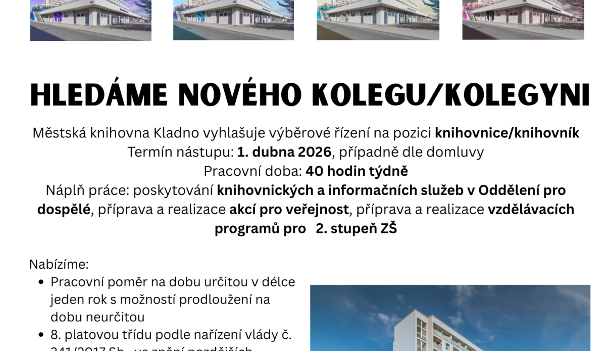 Městská knihovna Kladno vyhlašuje výběrové řízení na pozici knihovnice/knihovník
